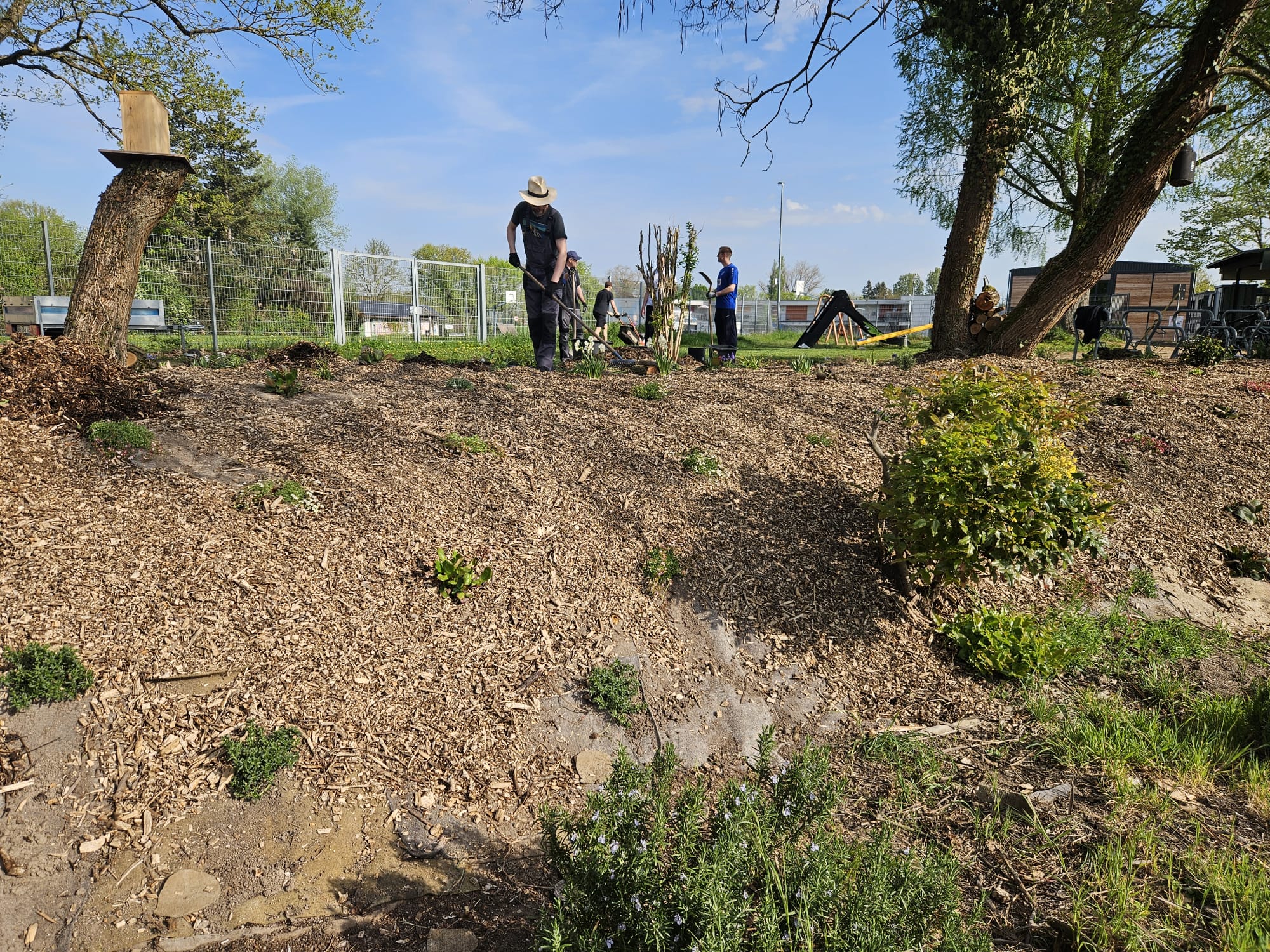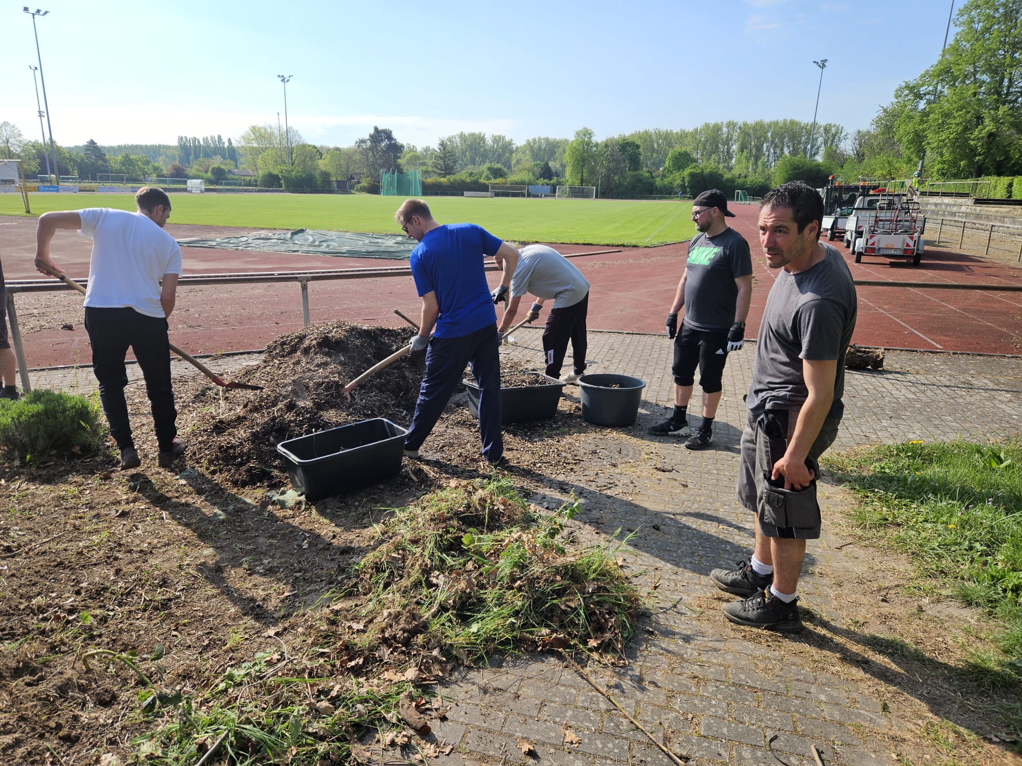 Im Laufe des Einsatzes wurde eine Vielzahl an Aufgaben erledigt. Die Tribüne wurde gründlich von Unkraut befreit und anschließend mit Vlies ausgelegt, neu bepflanzt und mit Hackschnitzeln versehen. Auch die Beete rund um das Stadion wurden von Unkraut gesäubert und wieder auf Vordermann gebracht. Am Funktionsgebäude kümmerte sich das Team um die Reinigung des Parkplatzes, während an anderer Stelle Hecken fachgerecht zurückgeschnitten wurden.
